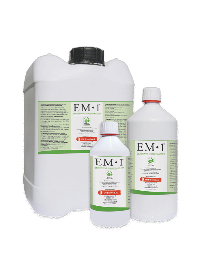 EM-1 ist die ideale Kombination ausgewählter, regenerativer Mikroorganismen für eine chemiefreie Landwirtschaft. Überwiegend sind Milchsäurebakterien, Hefen und Photosynthesebakterien enthalten. Es ist eine bräunliche Flüssigkeit mit süss-saurem Geruch und einem pH-Wert von 3.5. Alle anderen EM-Produkte und Anwendungen lassen sich auf EM-1 zurückführen. EM-1 kann mit Zuckerrohrmelasse, Wasser und Wärme zu EM-A vermehrt werden.