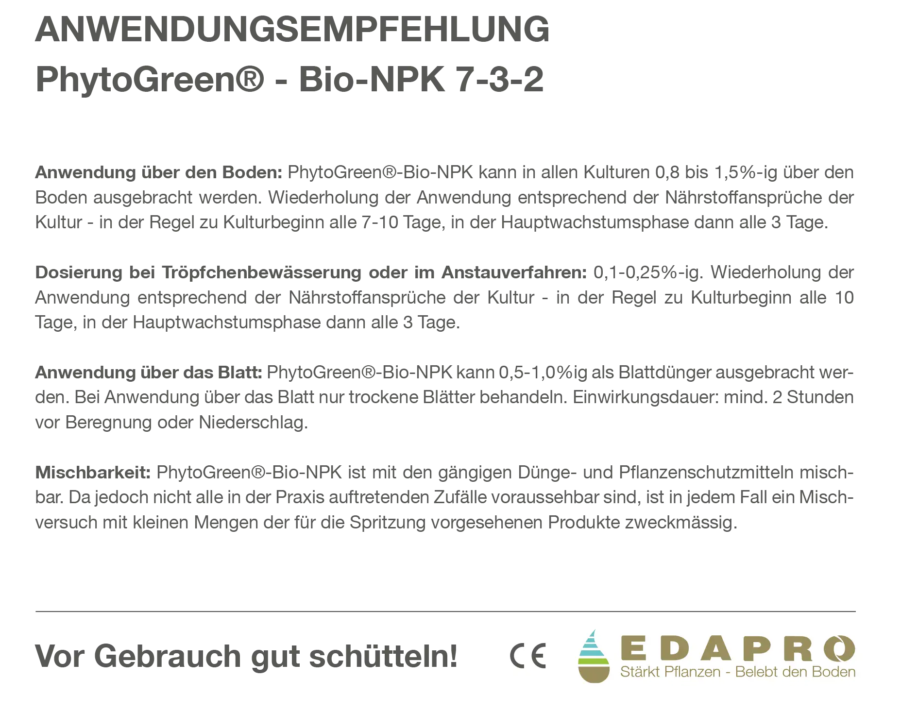 | Anwendung über den Boden | PhytoGreen®-Bio-NPK kann in allen Kulturen 0,8 bis 1,5%-ig über den Boden ausgebracht werden. Wiederholung der Anwendung entsprechend der Nährstoffansprüche der Kultur – in der Regel zu Kulturbeginn alle 7-10 Tage, in der Hauptwachstumsphase dann alle 3 Tage. |